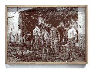 Canvas painted with mud and engraved, under a UV-resistant plexiglass cover and framed with wood.