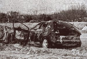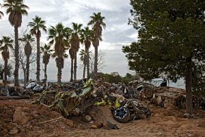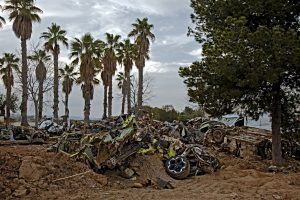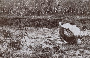 On one picture, the only color photographic print, we see the environmental vestiges of the disaster.