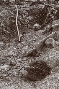 It created a series of binary images, originating from photographs I took along the ravine basin, which were subsequently engraved on canvas painted with mud paint.